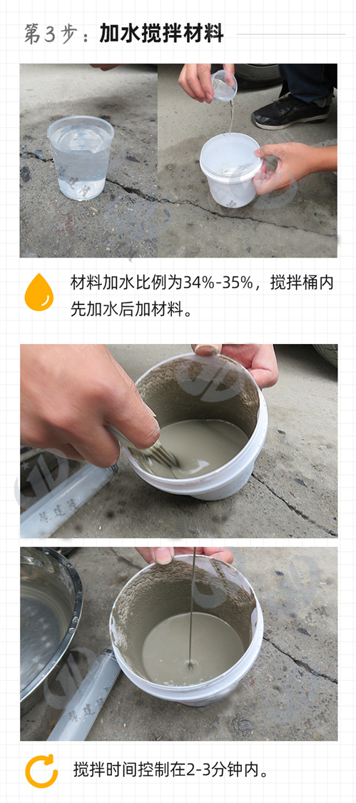 2、加水搅拌:将材料与水混合搅拌,加水量必须控制在26%到28%之间,即每袋50斤材料加水量为13斤水,根据修补不同部位,对材料稀释要求不同可适当调整加水量。