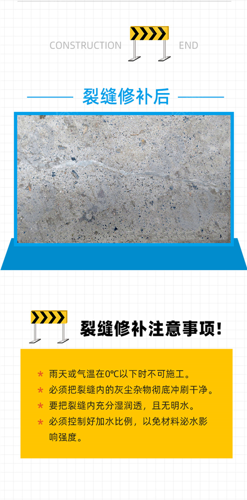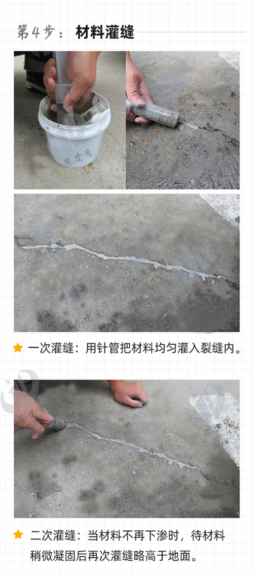 3、施工:将搅拌好的材料倒进需要修复的作业面裂缝中,灌浆的同时可采取用橡皮锤在缝隙的两边敲打震动使其更好的灌入灌实。